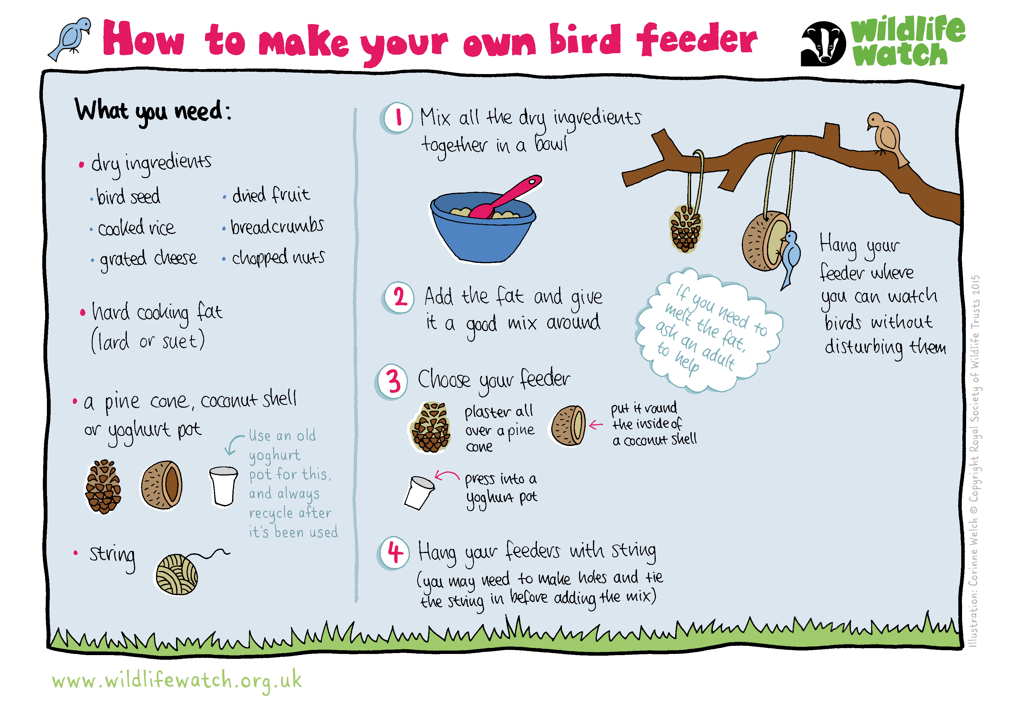 5. Home made - half coconuts or a pine cone covered in fat or vegetable suet can be hung from a tree. They will attract tits, greenfinches and house sparrows.