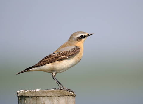 A summer visitor, the wheatear is a handsome chat, with black cheeks, white eyestripes, a blue back and a pale orange chest. Look for it on upland heaths and moors.