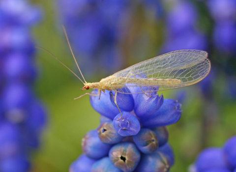 The common green lacewing is a lime green, delicate insect, with translucent, intricately veined wings. It is common in gardens and parks, where it helps to control aphid pests.