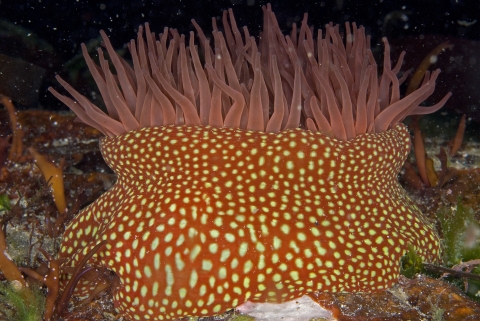 This large anemone is found on rocky shores around the UK and is so called because its green spots and red body means it looks like a strawberry!