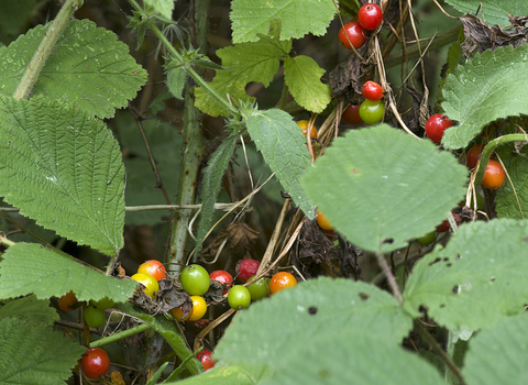 A climbing plant of hedgerows and woodlands, Black bryony produces greenish flowers in summer and red, shiny berries in autumn. It is a poisonous plant.