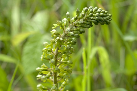 The Common twayblade has a pair of broad leaves that appear flush to the ground in March, before the flower stem grows. The single green flower spike bears the yellow-green flowers that look a little like tiny people. The stems can carry up to 100 flowers.