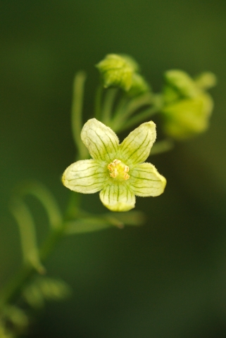 White bryony is a climbing hedgerow and woodland edge plant that flowers between May and August. It produces red and shiny berries that can be seen, covered in frost over winter. Our only native member of the cucumber family, White bryony is actually highly poisonous. The roots are particularly toxic and, despite their bitter taste, sometimes get eaten by cattle with fatal consequences.